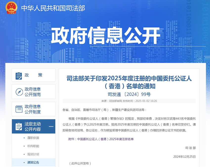 司法部關于印發2025年度注冊的中國委托公證人(香港)名單的通知